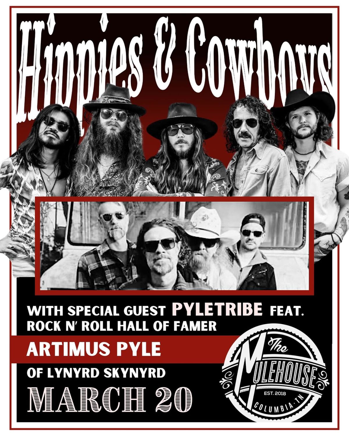 Hippies & Cowboys practically blew the roof off The Mulehouse when they hit the stage last year, so they're coming back for Round 2! This time, they'll bring PYLETRIBE feat. Lynyrd Skynyrd drummer & Rock & Roll Hall of Famer Artimus Pyle and his son Chris Pyle! Get ready for a high-octane evening of soulful southern rock and as the PYLETRIBE guys call it – "southern-fried tribal boogie"!!