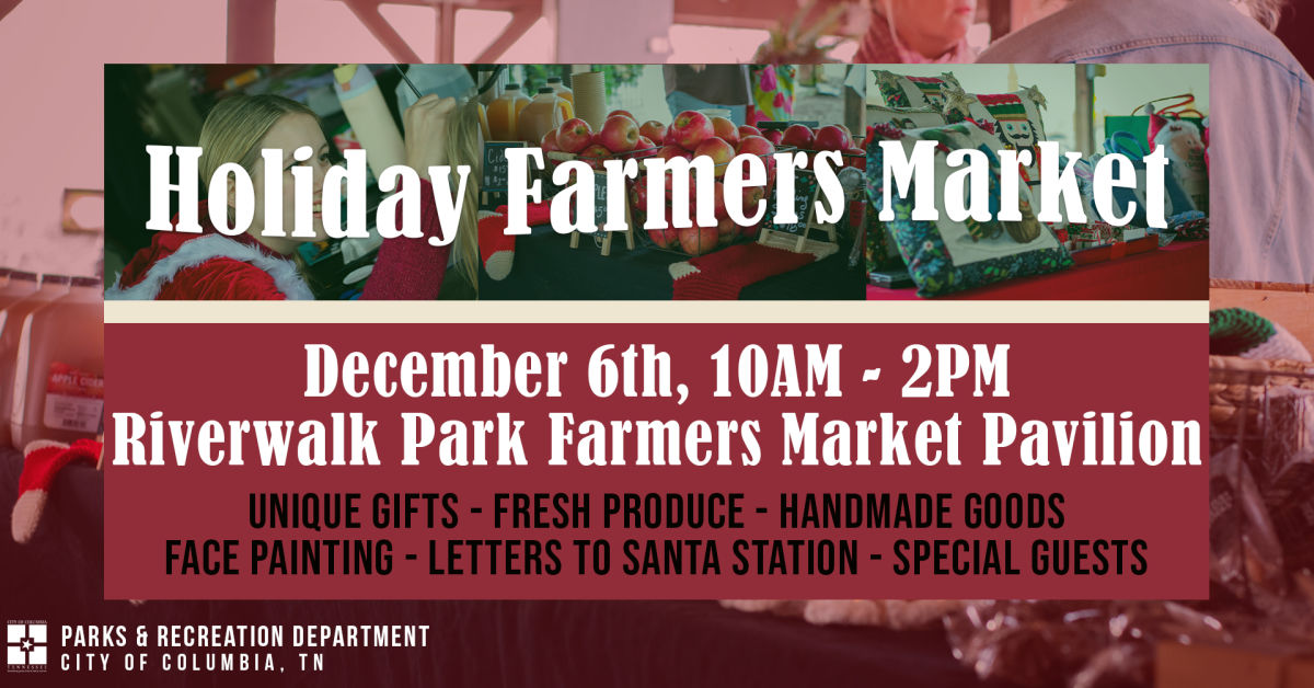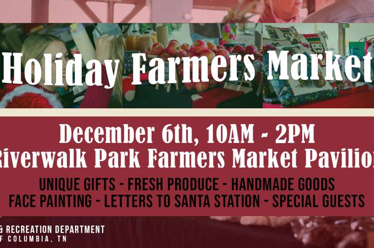 Head to Riverwalk Park on Saturday, December 6th from 10 am-2 pm for the Columbia Farmer's Market Holiday Special.