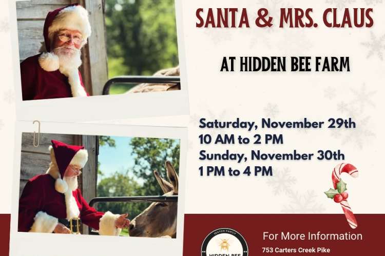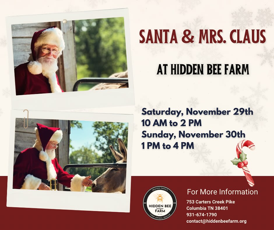 Mark your calendars and Hidden Bee Farm for a special holiday visit with Santa and Mrs. Claus.