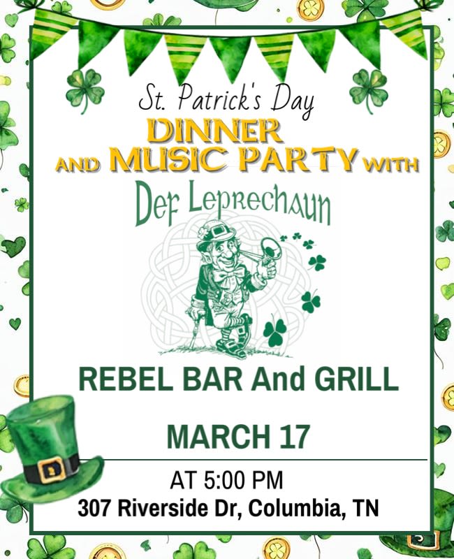 Join Rebel Bar & Grill for an amazing night of music, food and fun. They will be offering a Special St Patrick’s Day Menu packed with all your favorite Irish Dishes. Live music by Def Leprechaun starts at 5pm.
