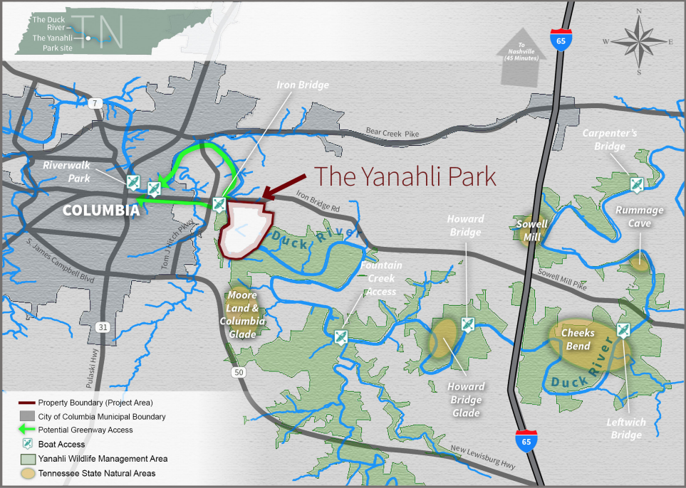 Yanahli Park is 474 acres of numerous ecosystems, diverse flora and fauna, unique geologic and hydrological features and habitat for potential rare, threatened, and endangered species. The park provides connectivity to the 12,000-acre Yanahli Wildlife Management Area. Yanahli is a Chickasaw word meaning "to flow through." Cheeks Bend 800-acre natural area is part of the Duck River Complex located within the Yanahli Wildlife Management Area (WMA) and managed by the TWRA. Cheeks Bend Bluff View Trail is a two-mile trail that wanders along the bluff overlooking the Duck River. The trail intersects with Rummage Cave, a short, horizontal cave with five oval rooms about 30 feet wide that bring you near the base of the bluff.
